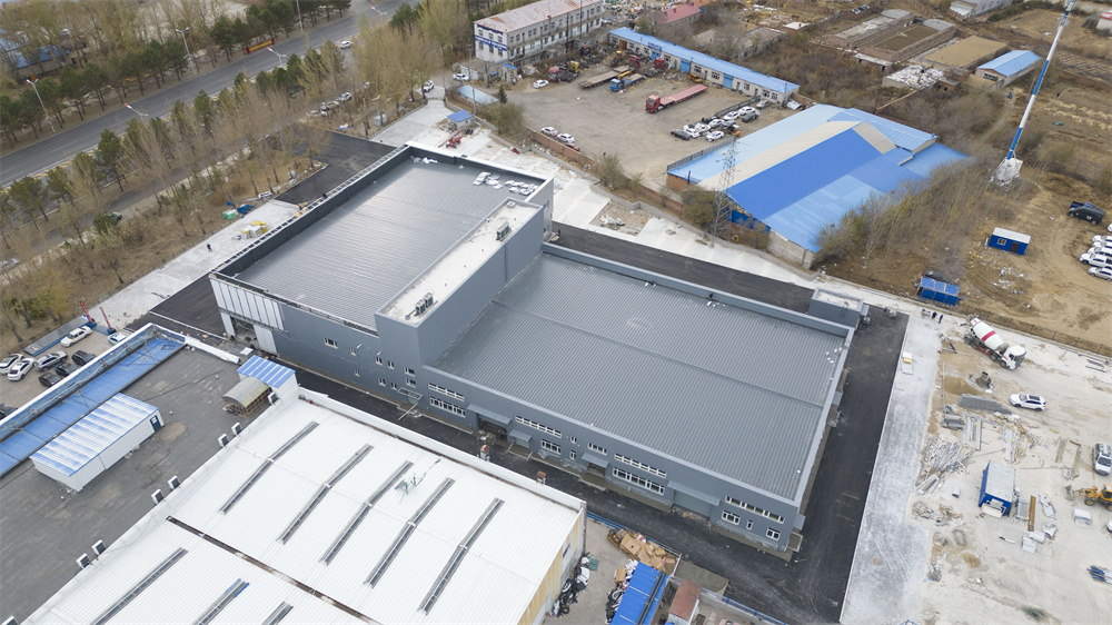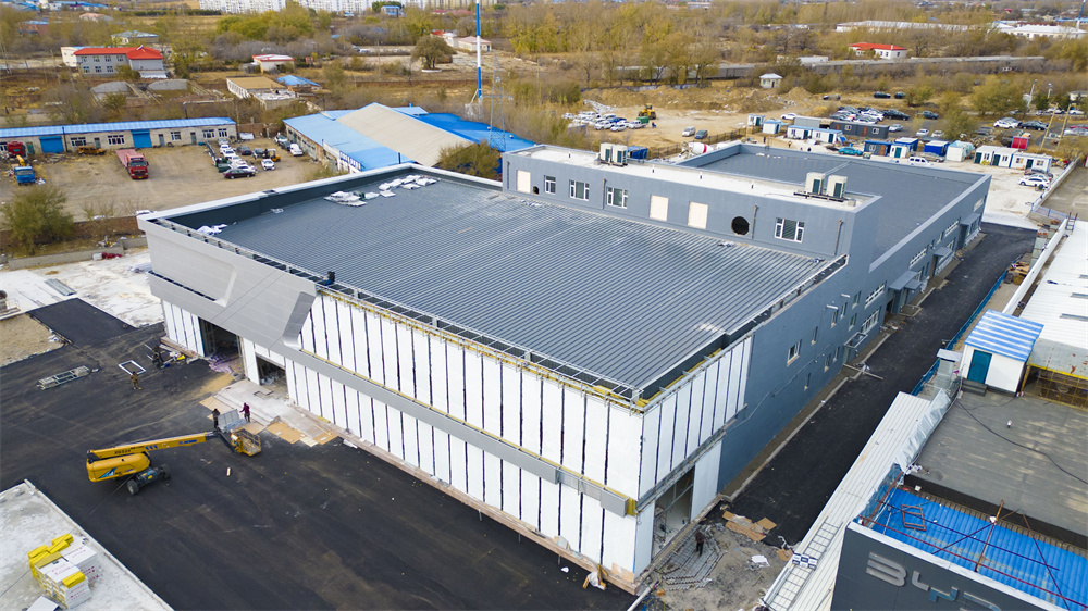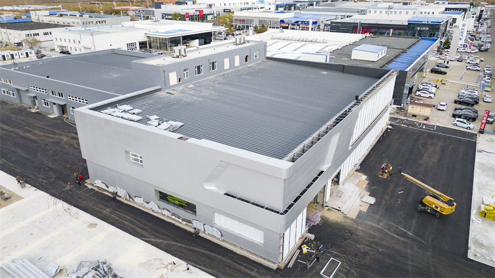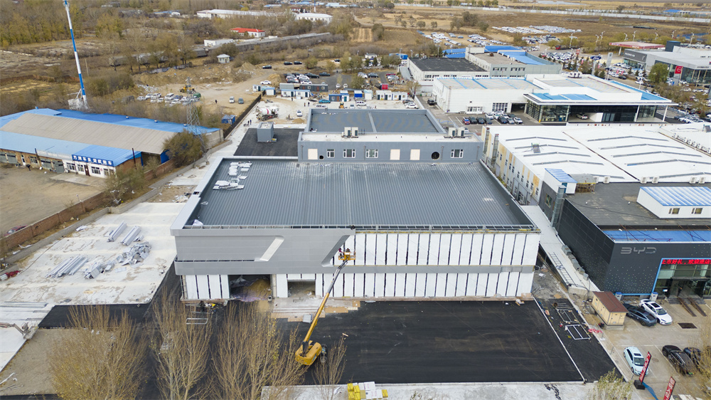 项目特点:该项目销售区为钢框架结构,维修区为门式钢架结构。钢框架部分结构夹层多种标高,增加了现场施工难度。屋面局部设置高位水箱间。维修区部分为34.61m跨度无中柱门式钢架结构,内部设置多个夹层梁,屋面保温为玻璃丝绵现场复合板,屋面外板均为475型360°咬合连接板。墙体均为士建墙体。
